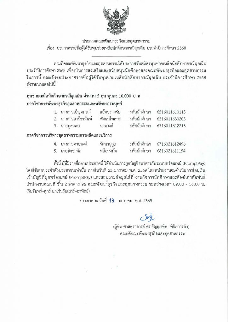 ประกาศรายชื่อผู้ที่ได้รับทุนช่วยเหลือนักศึกษากรณีฉุกเฉิน ประจำปีการศึกษา 2568